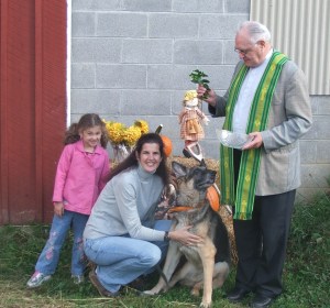 We celebrated the Feast of St. Francis of Assisi, Patron Saint of the Animals, on October 4, 2009. Many people came to the Farm with their dogs and cats for a special blessing on a glorious fall day. All horses and dogs were blessed by our dear friend Father Alexei Michalenko, presider at the Georgetown University Law Center Campus Ministry. We made sure to offer special blessings for our older equine and dog friends. The dog pictured is our beloved German Shepherd – Justie.