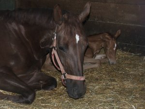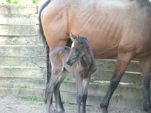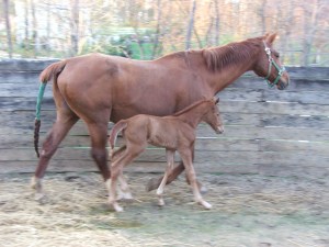 This Holiday weekend, many friends came to the Farm to visit with our two lovely fillies: Davignana (Always Katelyn 2010) and Eve (Farethewel 2010). The foals loved the extra attention. Little did everyone know that when they left the Farm on Sunday, that a third filly would join the “filly band” in the wee hours of Monday morning. We are thrilled and grateful to have three healthy fillies prancing in the paddocks this Spring.