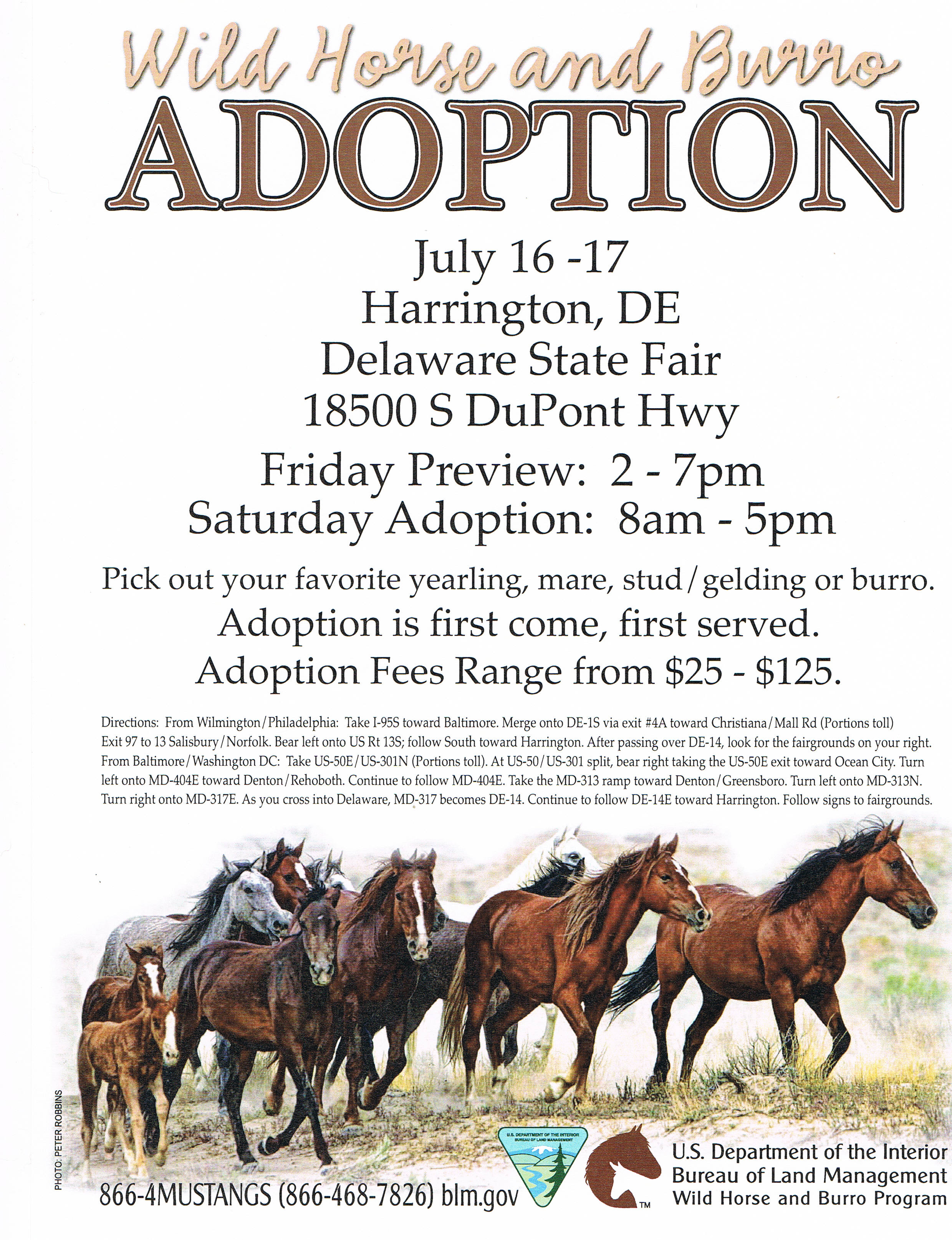 - This year, the BLM is having their summer adoption in Harrington, DE which is just a few hours from central Maryland. We have attended several BLM adoptions and encourage you to consider attending. These adoption events give you an excellent opportunity to learn about the care and feeding of wild horses and burros, see adopted mustangs who are now performing as hunters or barrel racers, and maybe to bring home a new mustang or burro of your own. The adoption fee for horses and burros ranges from $25 to $125 (this is not a typo!). Now more than ever mustangs and burros need adoptive homes. The BLM has changed its policy on providing for the wild horses and burros and the economy has made it more difficult for people to take on an additional horse. The Grand Illusion Horse Rescue adopted our mustang Winne in 2005 and our sweet burro Dapple in 2008. They are both wonderful additions to Shepherd Farm. The BLM brochure provides all the contact information for the July event. Help save a life!