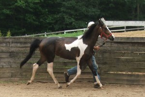 Marquis has beautiful gaits, a remarkably sweet temperament, and is coming along well in her training. Marquis has a nice overtrack at the walk. She has a floaing trot with lovely extension when trotting at liberty. Marquis also has an easy, rythmic canter. Marquis has such a sweet temperament. She is super easy to handle. She is good for the vet, farrier, for baths and is a solid loader. Marquis is progressing well in her training. She is trotting in hand and is working on the lunge. She will be lightly started under saddle later this fall.